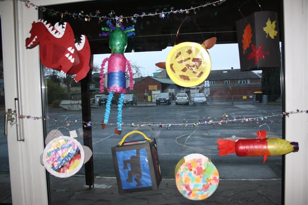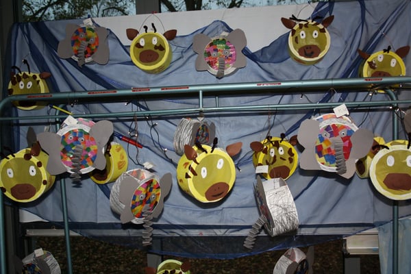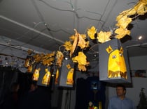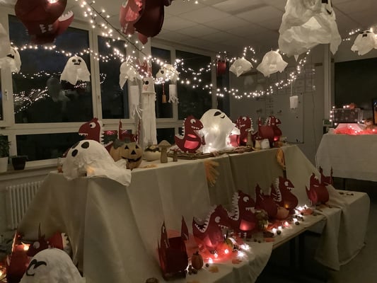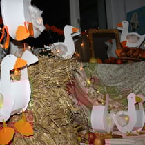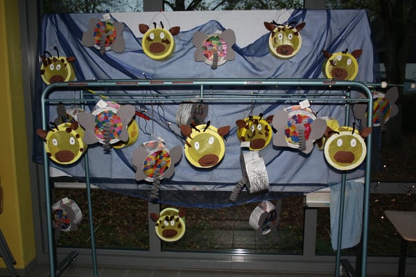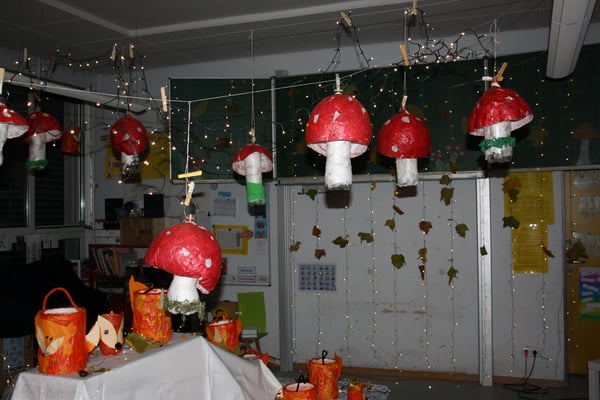 In der Woche vor dem Martinszug werden mit engagierter Elternhilfe vier Klassenräume, die Flure und das Treppenhaus dekoriert. Da sich immer zwei Klassen einen Raum teilen, gestalten auch die