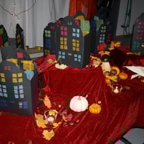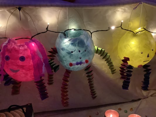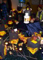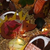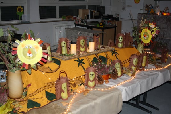 Eltern dieser beiden Klassen mit den Lehrern den Raum. Mitgebrachte Tücher, Decken, Steine, Herbstlaub, Blumen, Streudeko, Spiegel, Kerzen und Lichterketten und nicht zuletzt die Martinslaternen
