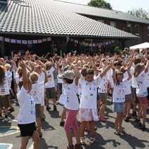 Passend zum Thema unseres Schulfestes erreichte das Thermometer mit über 30 Grad afrikanische Temperaturen. Zum Auftakt zogen alle Kinder der Schule und die Lehrerinnen in selbstbedruckten T-shirts zur Musik tanzend und winkend ein, um danach mit einem afrikanischen Tanz alle Eltern und Gäste begrüßen zu können. Hierbei wurden die Kinder von den Klassen 3a, 3b und 4b mit Rhythmen auf selbstgebauten Trommeln effektvoll begleitet. Nach einer kurzen Begrüßungsrede von Herrn Leweke hatten die Kinder viel Spaß an Spieleständen mit afrikanischen Kinderspielen. Zusätzlich wurden bunte Bänder in die Haare geflochten, Gipsmasken hergestellt, Kindergesichter geschminkt, Musikinstrumente gebastelt und Armbänder nach afrikanischem Vorbild hergestellt. Die Lose für eine sehr reichhaltig bestückte Tombola fanden ebenso ihre Abnehmer wie die Waffeln, der Kuchen, die Salatbar und die leckeren Würstchen und Maiskolben vom Grill. Den weitaus besten Verkauf verzeichnete allerdings der Stand mit kalten Getränken.
