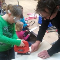 Mit allen Klassen werden die Holzpfosten des Vordachs unserer Schule gestaltet. Zu einem selbst gewählten Thema sägen die Kinder Figuren, Tiere und Objekte aus, malen sie an und befestigen sie an den Holzpfosten.